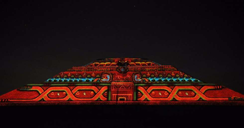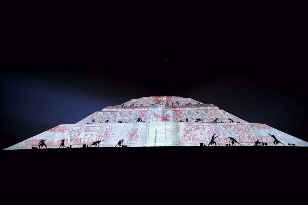 En la segunda parte del espectáculo, los asistentes conocen la cosmogonía teotihuacana y el trazo de la ciudad de los dioses, a través de un videomapping que se proyecta sobre la Pirámide del Sol.