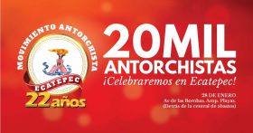 *Veinte mil antorchistas se reunirán el 28 de enero en Ecatepec.. El Movimiento Antorchista en Ecatepec realizará un evento para festejar su 22 aniversario en donde se reunirán más de 20 mil antorchistas, evento al que asistirá el dirigente de la organización en el Estado de México, informó Camelia Domíngue